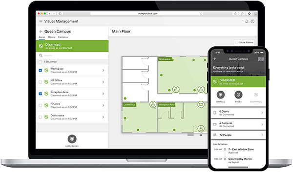 Combineer inbraakbeveiliging met camerabewaking en bekijk met MAXPRO Cloud live streaming video of opgenomen videoclips op de computer, tablet of smartphone.